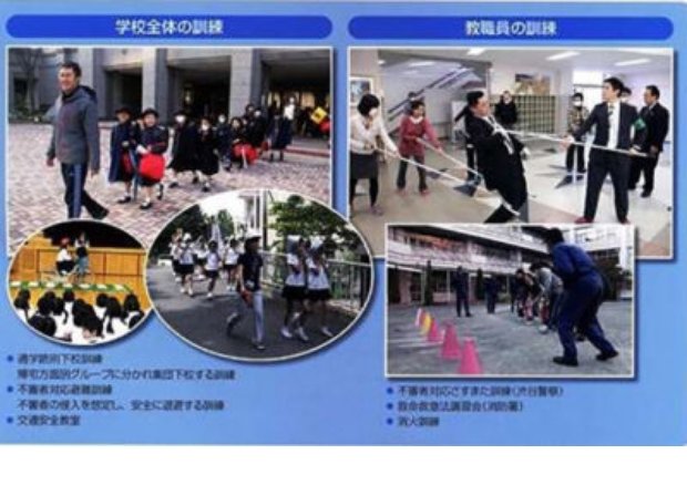 そのほか、危機管理マニュアルを活用し、不審者が侵入した場合を想定した訓練を年に数回実施しています。 また、警備会社による正門でのチェック、校内の定期的巡視を義務づけています。 最近では、児童の事故に備え、AED(自動体外式除細動器)を保健室に常設しました。全教職員が救命救急法 の講習を受けることで、機器の取り扱いについての習熟を図っています。